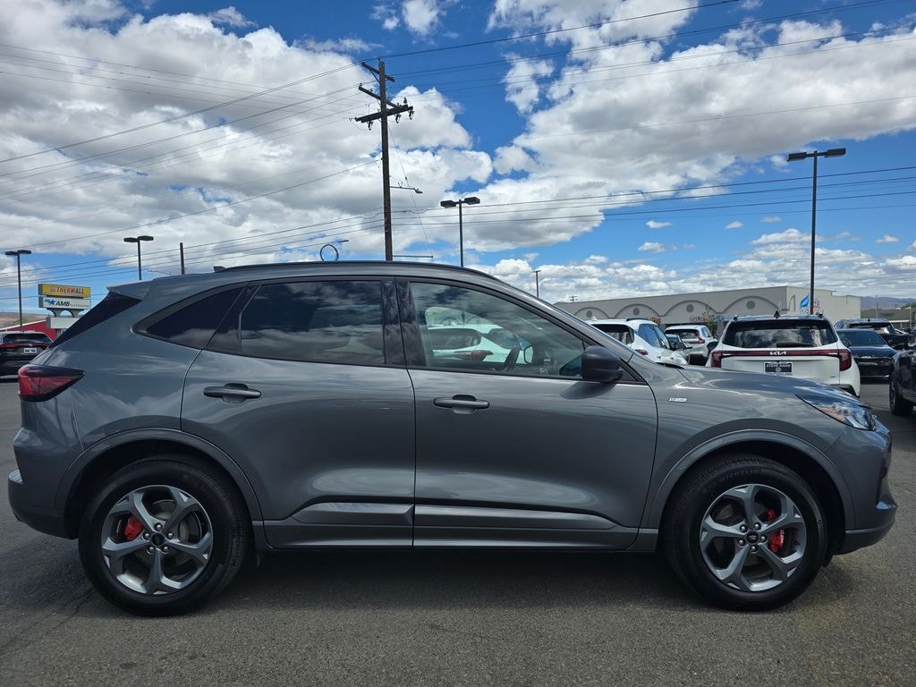 CARFAX One-Owner. Gray Metallic 2024 Ford Escape ST-Line 1.5L EcoBoost 8-Speed Automatic AWD 4D Sport Utility AWD, 3.81 Axle Ratio, 4-Wheel Disc Brakes, 6 Speakers, ABS brakes, Air Conditioning, Alloy wheels, AM/FM radio: SiriusXM, AM/FM Stereo, Auto High-beam Headlights, Automatic temperature control, Brake assist, Bumpers: body-color, Cold Weather Package, Compass, Delay-off headlights, Driver door bin, Driver vanity mirror, Dual front impact airbags, Dual front side impact airbags, Easy Access Cargo Shade, Electronic Stability Control, Emergency communication system: SYNC 4 911 Assist, Equipment Group 300A, Exterior Parking Camera Rear, FordPass Connect, Four wheel independent suspension, Front & Rear Floor Liners w/Carpet Mats, Front anti-roll bar, Front Bucket Seats, Front Center Armrest, Front dual zone A/C, Front License Plate Bracket, Front reading lights, Fully automatic headlights, Heated Front Row Seats, Heated Sideview Mirrors, Heated Steering Wheel, Illuminated entry, Knee airbag, Low tire pressure warning, Occupant sensing airbag, Outside temperature display, Overhead airbag, Overhead console, Panic alarm, Passenger door bin, Passenger vanity mirror, Power door mirrors, Power driver seat, Power Liftgate, Power steering, Power windows, Radio data system, Rear anti-roll bar, Rear reading lights, Rear seat center armrest, Rear window defroster, Rear window wiper, Remote keyless entry, Remote Starter System, Roof rack: rails only, Speed control, Speed-sensing steering, Speed-Sensitive Wipers, Split folding rear seat, Spoiler, Sport steering wheel, Steering wheel mounted audio controls, SYNC 4, Tachometer, Telescoping steering wheel, Tilt steering wheel, Traction control, Trip computer, Variably intermittent wipers, Vinyl/Cloth Front Sport Contour Bucket Seats, Wheels: 18" Rock Metallic Painted Aluminum, AWD.