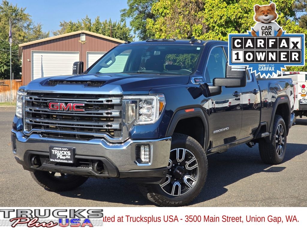 CARFAX One-Owner. Blue 2023 GMC Sierra 2500HD SLE 6.6L V8 6-Speed Automatic 4WD Double Cab 6-Speed Automatic, 4WD, Cloth, 17" Machined Aluminum Wheels, 2-Speed Electronic Shift Transfer Case, 3.73 Rear Axle Ratio, 4-Way Manual Driver Seat Adjuster, 4-Way Manual Passenger Seat Adjuster, 4-Wheel Disc Brakes, 6 Speakers, 6-Speaker Audio System Feature, ABS brakes, Air Conditioning, Alloy wheels, AM/FM radio: SiriusXM, Apple CarPlay/Android Auto, Brake assist, Bumpers: chrome, Chrome Surround Grille w/High Gloss Black Mesh, Cloth Seat Trim, Compass, Compass Located In Instrument Cluster, Deep-Tinted Glass, Delay-off headlights, Driver door bin, Driver vanity mirror, Dual front impact airbags, Dual front side impact airbags, Electronic Stability Control, Emergency communication system: OnStar and GMC connected services capable, Exterior Parking Camera Rear, Front 40/20/40 Split-Bench Seats, Front anti-roll bar, Front Center Armrest w/Storage, Front reading lights, Front wheel independent suspension, Fully automatic headlights, GMC Connected Access Capable, Heated door mirrors, Heavy-Duty 80 Amp Battery, Illuminated entry, Integrated Trailer Brake Controller, Low tire pressure warning, Manual Tilt Wheel Steering Column, Occupant sensing airbag, OnStar & GMC Connected Services Capable, Outside temperature display, Overhead airbag, Overhead console, Panic alarm, Passenger door bin, Passenger vanity mirror, Pickup Box, Power Door Locks, Power door mirrors, Power Rear Windows w/Express Down, Power steering, Power windows, Power Windows w/Driver Express Up/Down, Premium audio system: GMC Infotainment System, Radio: AM/FM w/GMC Infotainment System, Rear reading lights, Rear step bumper, Remote Keyless Entry, Remote keyless entry, SiriusXM Radio, Speed control, Split folding rear seat, Steering Wheel Audio Controls, Steering wheel mounted audio controls, Suspension Package, Tachometer, Tilt steering wheel, Traction control, Trip computer, Turn signal indicator mirrors, Variably intermittent wipers, Voltmeter, Wi-Fi Hotspot Capable, 6-Speed Automatic, 4WD, Cloth.