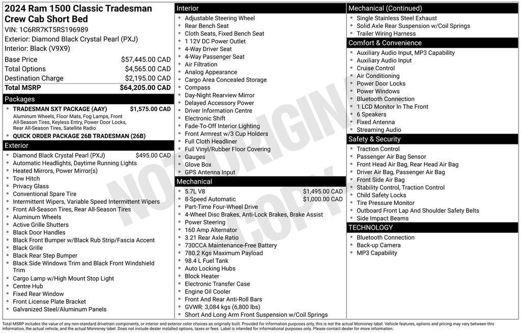 Recent Arrival! Clean CARFAX. Diamond Black Crystal Pearlcoat 2024 Ram 1500 Classic Tradesman HEMI 5.7L V8 Multi Displacement VVT 8-Speed Automatic 4WD 4D Crew Cab 17" x 7" Steel Wheels, 20" x 8" Aluminum Wheels, 3.21 Rear Axle Ratio, 4-Wheel Disc Brakes, 40/20/40 Split Bench Seat, 6 Speakers, ABS brakes, Active Grille Shutters, Air Conditioning, AM/FM radio, Audio Input Jack for Mobile Devices, Black Exterior Mirrors, Body Color Upper Fascia, Brake assist, Bright Front Bumper, Bright Grille, Bright Rear Bumper, Carpet Floor Covering, Center Hub, Cloth 40/20/40 Bench Seat, Compass, Delay-off headlights, Driver door bin, Dual front impact airbags, Dual front side impact airbags, Dual Rear Exhaust w/Bright Tips, Electronic Shift, Electronic Stability Control, Exterior Mirrors w/Heating Element, For More Info, Call 800-643-2112, Front anti-roll bar, Front Armrest w/3 Cupholders, Front Center Armrest, Front Floor Mats, Front Fog Lamps, Front wheel independent suspension, Fully automatic headlights, GPS Antenna Input, Heated door mirrors, Heavy Duty Vinyl 40/20/40 Split Bench Seat, Integrated Voice Command w/Bluetooth, Low tire pressure warning, Manual Adjust Seats, No Satellite Coverage w/HI/AK/PR/VI/GU, Occupant sensing airbag, Outside temperature display, Overhead airbag, Overhead console, ParkView Rear Back-Up Camera, Passenger door bin, Power door mirrors, Power steering, Power windows, Quick Order Package 26B Tradesman, Radio data system, Radio: Uconnect 3 w/5" Display, Rear anti-roll bar, Rear Floor Mats, Rear Folding Seat, Rear seat center armrest, Rear step bumper, Remote Keyless Entry w/All-Secure, Remote USB Port, Remote USB Port - Charge Only, SiriusXM Radio Service, SiriusXM Satellite Radio, Speed control, Storage Tray, Tachometer, Tilt steering wheel, Tip Start, Traction control, Tradesman Package, Tradesman SXT Package, Variably intermittent wipers, Voltmeter.