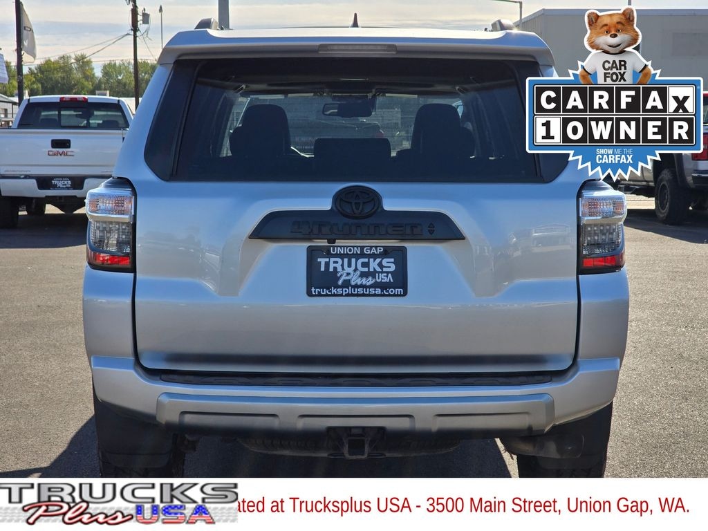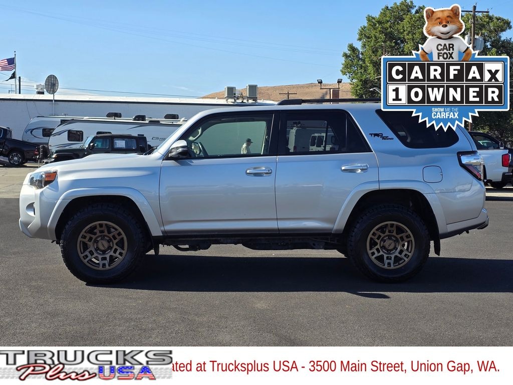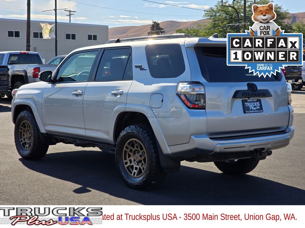 CARFAX One-Owner. Clean CARFAX. Silver 2023 Toyota 4Runner TRD Off-Road Premium 4.0L V6 DOHC 24V 5-Speed with ECT 4WD 4D Sport Utility 4WD, 3.727 Axle Ratio, 4-Wheel Disc Brakes, 8 Speakers, ABS brakes, Air Conditioning, Alloy wheels, AM/FM radio: SiriusXM, Anti-whiplash front head restraints, Apple CarPlay/Android Auto, Auto High-beam Headlights, Auto-dimming Rear-View mirror, Black Roof Rails, Brake assist, Bumpers: body-color, Compass, Driver door bin, Driver vanity mirror, Dual front impact airbags, Dual front side impact airbags, Electronic Stability Control, Emergency communication system: Safety Connect (1-year trial), Exterior Parking Camera Rear, Front anti-roll bar, Front Bucket Seats, Front Center Armrest, Front fog lights, Front reading lights, Front wheel independent suspension, Garage Door Opener, Garage door transmitter: HomeLink, Heated door mirrors, Heated Front Bucket Seats, Heated front seats, Heated Outside Rear-View Mirrors, Illuminated entry, Knee airbag, Leather Shift Knob, Low tire pressure warning, Navigation System, Occupant sensing airbag, Outside temperature display, Overhead airbag, Overhead console, Panic alarm, Passenger door bin, Passenger vanity mirror, Power door mirrors, Power driver seat, Power passenger seat, Power steering, Power windows, Radio: Premium Audio w/Dynamic Navigation, Rear anti-roll bar, Rear seat center armrest, Rear window defroster, Rear window wiper, Remote keyless entry, Roof rack: rails only, Security system, SofTex Seat Trim, Speed control, Speed-sensing steering, Split folding rear seat, Spoiler, Steering wheel mounted audio controls, Tachometer, Telescoping steering wheel, Tilt steering wheel, Traction control, Trip computer, Turn signal indicator mirrors, Variably intermittent wipers, Wheels: 17" Unique 7-Spoke Off-Road Alloy, 4WD.